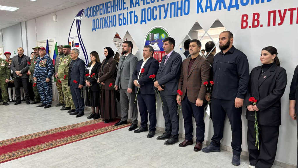 В мероприятии приняли участие мать первого участника специальной военной операции, удостоенного звания Героя России, Нурмагомеда Гаджимагомедова — Сапижат Мазаева, представители ветеранских и общественных организаций, депутаты, а также педагогический коллектив и учащиеся школы.