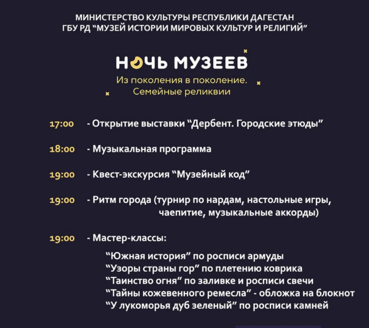 Не упустите возможность провести незабываемый вечер в кругу близких, погрузившись в историю и культуру Дагестана. Приходите на «Ночь музеев»!