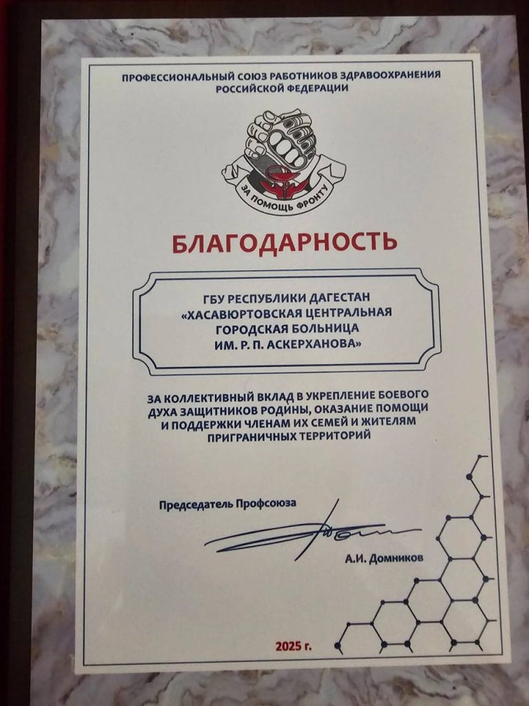 Хасавюртовская центральная городская больница имени Р. П. Аскерханова удостоена благодарности от Профсоюза работников здравоохранения Российской Федерации.