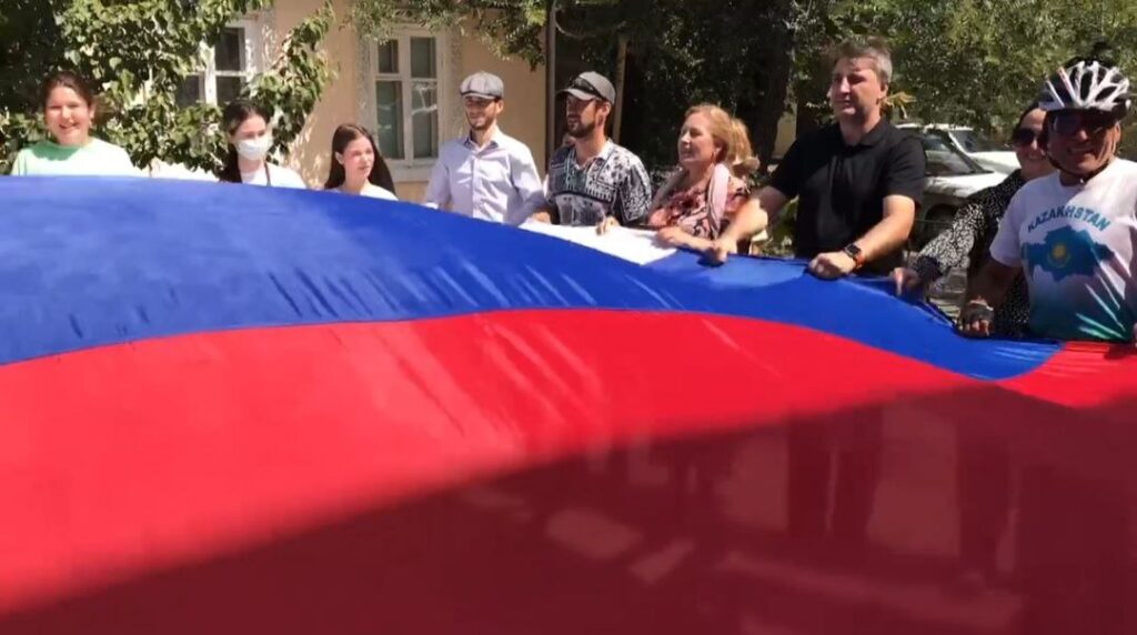 Кроме того, на оживленных улицах города волонтеры раздали ленточки с российским флагом.